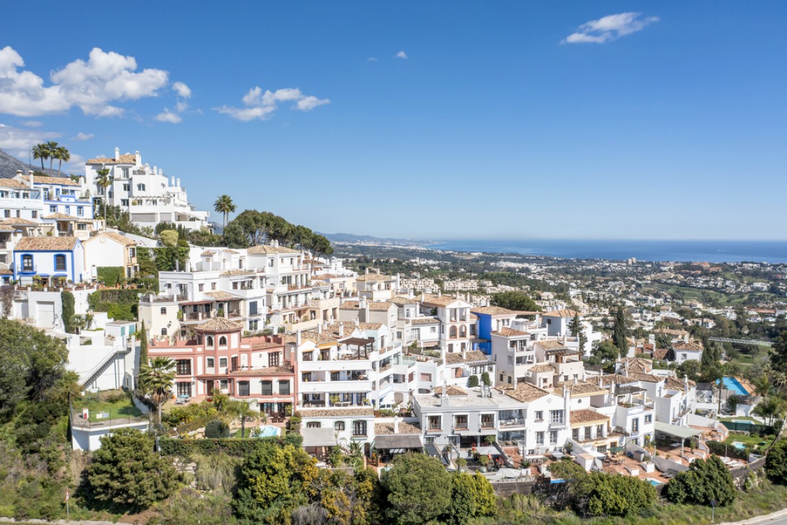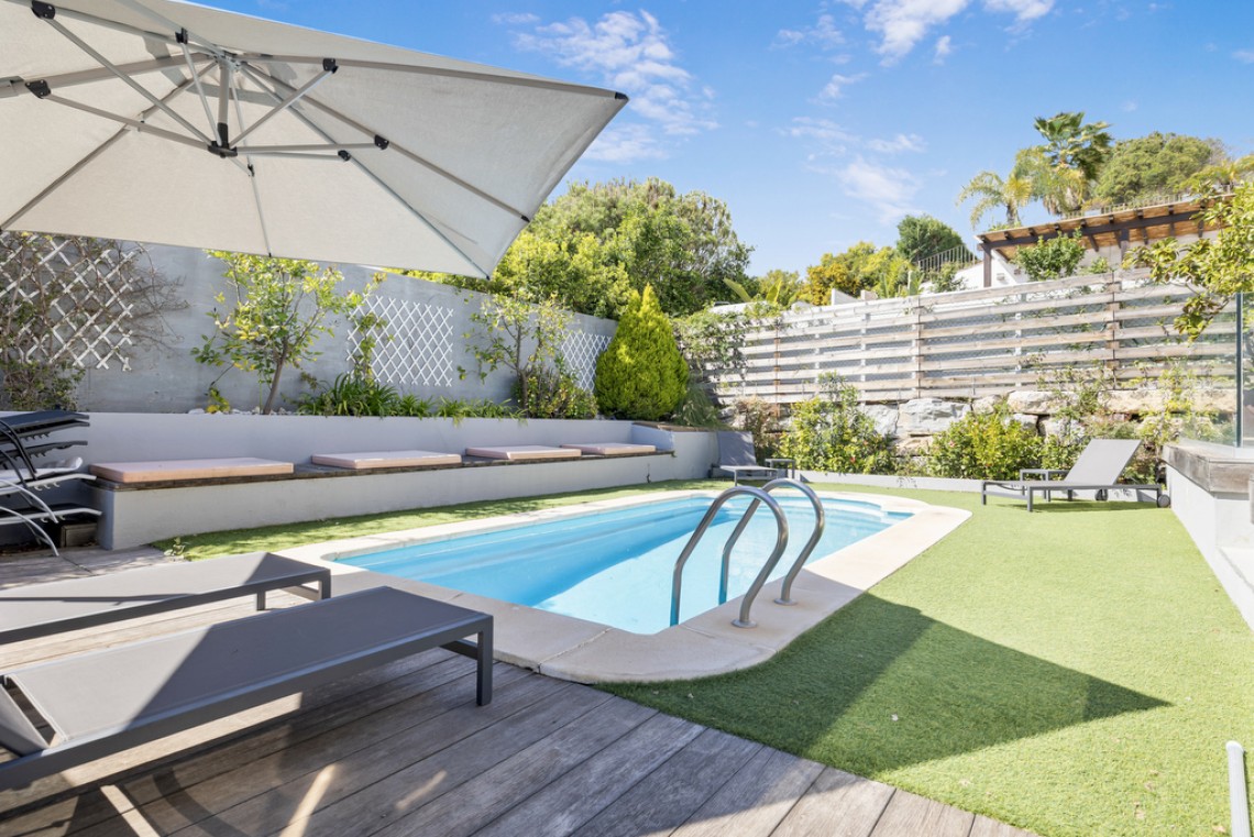 Dieses außergewöhnliche Stadthaus mit fünf Schlafzimmern vereint modernes Design mit andalusischem Charme. Nach Süden und Westen ausgerichtet, genießt es den ganzen Tag über Sonnenlicht und wurde teilweise renoviert, um eine stilvolle und einladende Atmosphäre zu schaffen. Mit einer bebauten Fläche von 312 m² plus Terrassen erstreckt sich das Haus über drei Ebenen und bietet helle Innenräume sowie liebevoll gestaltete Außenbereiche. Der Wohnbereich verfügt über einen Kamin und eine offene Küche mit hochwertigen Bosch- und Liebherr-Geräten, die direkt auf eine Terrasse mit Lounge, BBQ-Bereich und privatem Pool führt. Die obere Etage umfasst die Mastersuite mit Ankleidebereich und eigenem Bad sowie ein zusätzliches Gästezimmer mit Bad. Im unteren Bereich befinden sich drei weitere Schlafzimmer, zwei Badezimmer und ein Hauswirtschaftsraum. Weitere Ausstattungsmerkmale sind Klimaanlage mit Heizung, Fußbodenheizung in den Hauptwohnbereichen und im Obergeschoss sowie eine private Garage. In idealer Lage, nahe den Golfplätzen, allen Annehmlichkeiten und nur wenige Fahrminuten von Strand und Marbella entfernt, verkörpert dieses Townhouse das Beste des eleganten mediterranen Lebensstils.