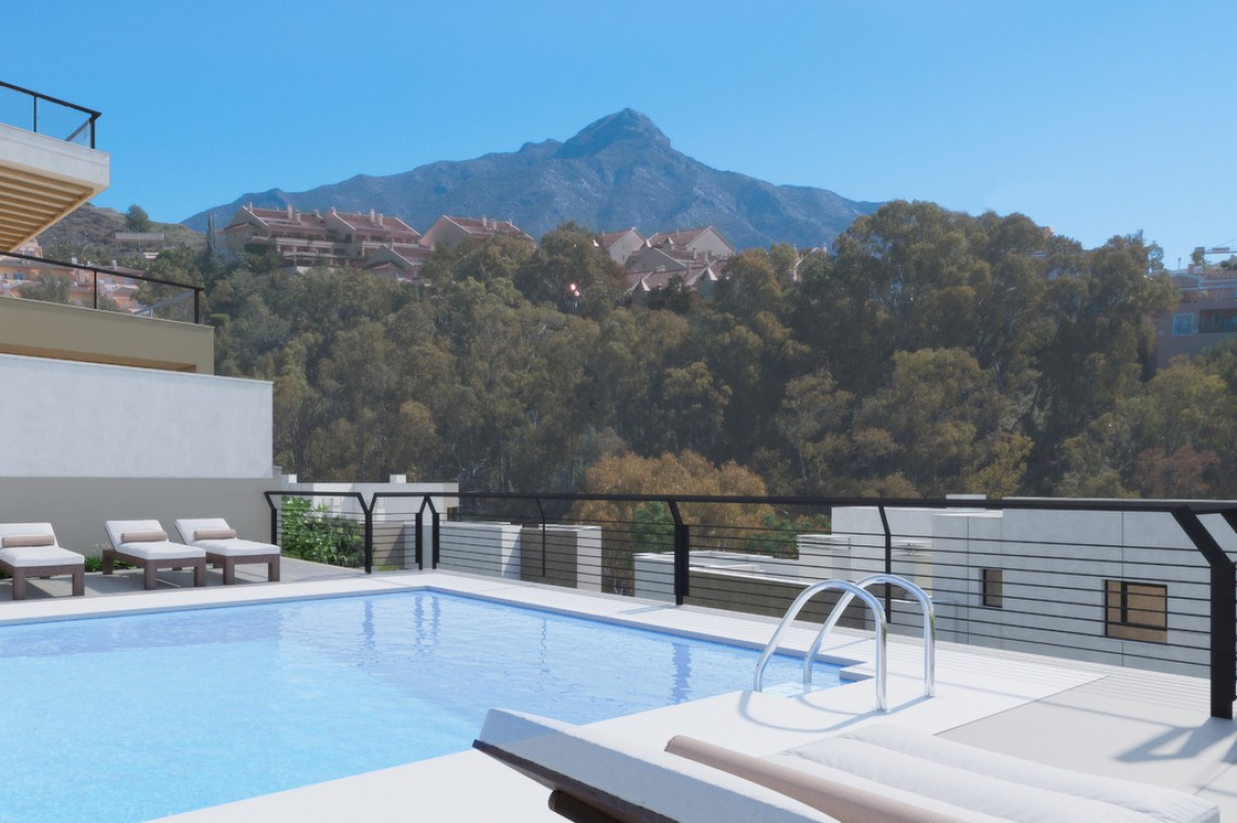 Dieses moderne Wohnensemble befindet sich in der Nähe eines der besten Golfresorts mit einem breiten Angebot an Sport- und Freizeiteinrichtungen und umfasst rund 90 Einheiten, nur ein exklusives Penthouse ist noch verfügbar! In einer der begehrtesten Lagen von Nueva Andalucía gelegen, bietet es eine privilegierte Position mit fantastischem Panoramablick auf den Golfplatz, die Berge und das Meer. Das Design basiert auf offenen, lichtdurchfluteten Räumen, die im Stil von Boho & Country Chic gestaltet sind und natürliche Materialien sowie sanfte Farbtöne vereinen, die eine entspannte Wohnatmosphäre schaffen. Ein besonderes Highlight ist die große Terrasse, ideal zum Genießen des mediterranen Lebensstils im Freien. Die Anlage wurde nach höchsten Standards der Energieeffizienz gebaut, mit ausgezeichneter Wärme- und Schalldämmung sowie hochwertigen Materialien und moderner Technologie. Das Penthouse verfügt über einen eigenen Stellplatz und einen Abstellraum, während die Bewohner großzügige Gartenanlagen und einen großen Gemeinschaftspool genießen können.